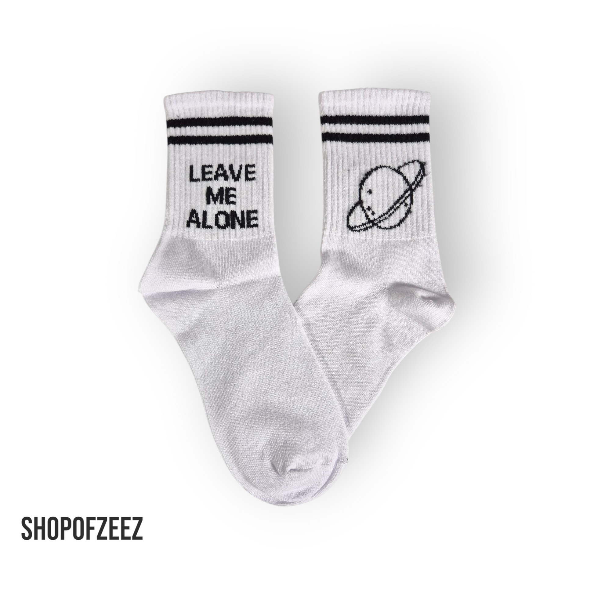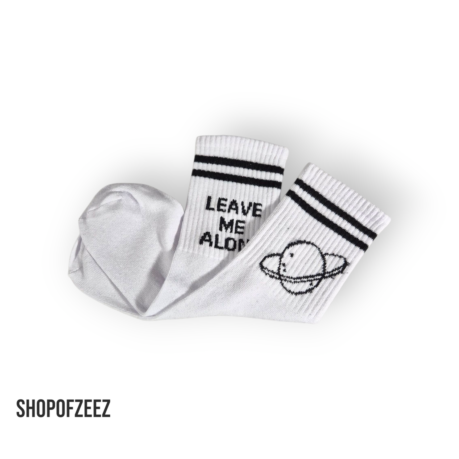 Mit Planet auf einem Fuß und einem frechen „Leave me alone“-Spruch auf weißem Planetenhintergrund auf dem anderen bringen diese hochwertigen Baumwollsocken Persönlichkeit in Ihren Alltag.